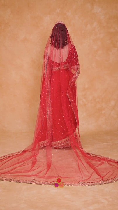 It's your D-day, be a statement bride, be the center of attraction, turn around the heads when you make an entry leaving a starry trail behind you. A long dupatta that will not only add charm to your lehenga but will also make your entry iconic with this Bridal Veil Beauty Red Stone Saubhaugyavati Net
