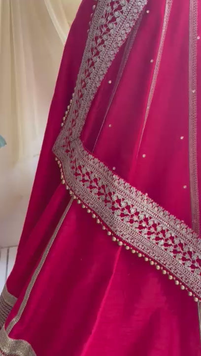 A celebration of timeless beauty — this bridal red net dupatta embodies grace and grandeur. Crafted from fine net fabric, it features delicate sequin accents scattered across the drape, creating a soft, ethereal shimmer. The highlight lies in its intricately embroidered golden zari border, enriched with fine detailing and tiny bead edging that adds a regal bridal touch.