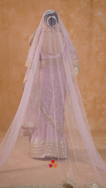 This gorgeous Bridal Veil Pink Magic Trail Embroidered Fringed Net comes with a traditional and festive Pink tone . To enhance this, a detailed and fine thread and sequin border on silk with dainty fringes on the edges. Look like a queen wearing the Bridal Veil with this net stone work embroidered veil from anokherang.