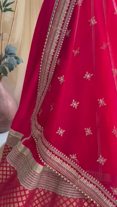 A beautiful bride in anokherang Bridal Saanjh Red Embroidered Sequin Organza Dupatta creates magic on her big day. This stunning red dupatta, adorned with luxurious golden embroidery and shimmering sequins, adds a regal touch to any bridal look. The delicate gold motifs and beadwork on the borders lend a rich, traditional charm. Perfect for weddings and festive occasions, this timeless piece effortlessly elevates any ensemble with grace and elegance. Drape yourself in this beauty, and let it make a statement at your special event