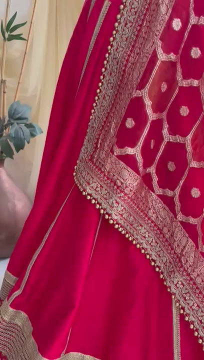 Bridal Sangam Red Zari Embroidered Organza Dupatta is a perfect blend of tradition and elegance. It features intricate gold zari embroidery with hexagonal patterns and delicate floral motifs, creating a...