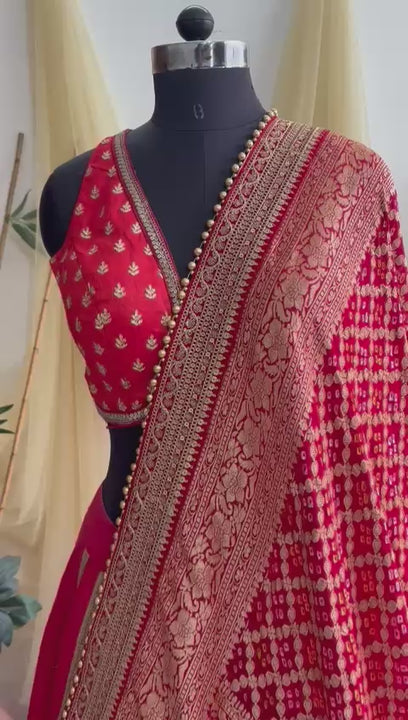 Drape yourself in timeless elegance with our red Banarasi Dupatta, a true celebration of heritage and artistry. Adorned with intricate zari checks and delicate floral motifs, its beauty is elevated by a meenakari-inspired multicolor border that adds vibrance and depth. Perfect for weddings, festivities, or heirloom collections, this dupatta transforms any ensemble into a statement of grace and tradition.