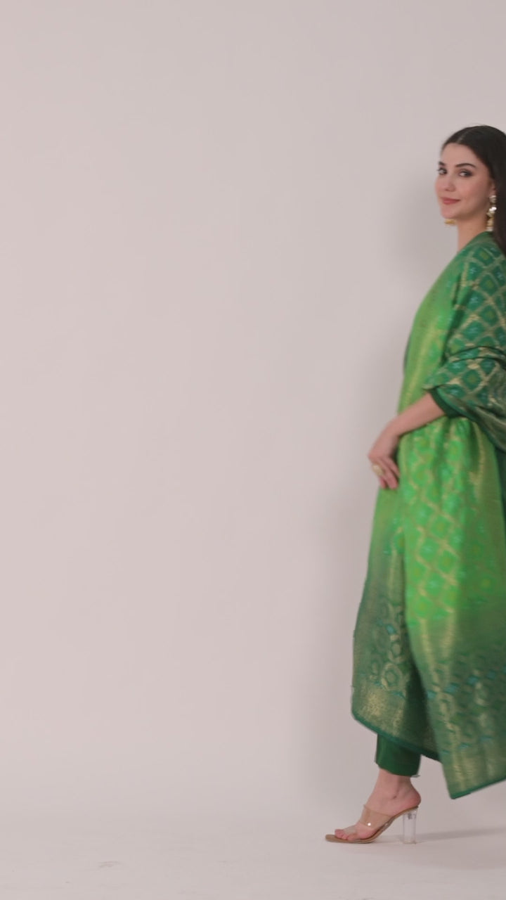 Grace meets grandeur in this exquisite Emerald Glow Banarsi Silk Dupatta Set. Crafted in rich hues of deep green, the outfit features a minimal straight-cut kurti and pants, paired with a stunning Banarsi silk dupatta woven in intricate golden zari motifs. The luminous sheen and traditional Banarsi artistry make it a perfect pick for festive celebrations, wedding functions, and elegant evening gatherings.