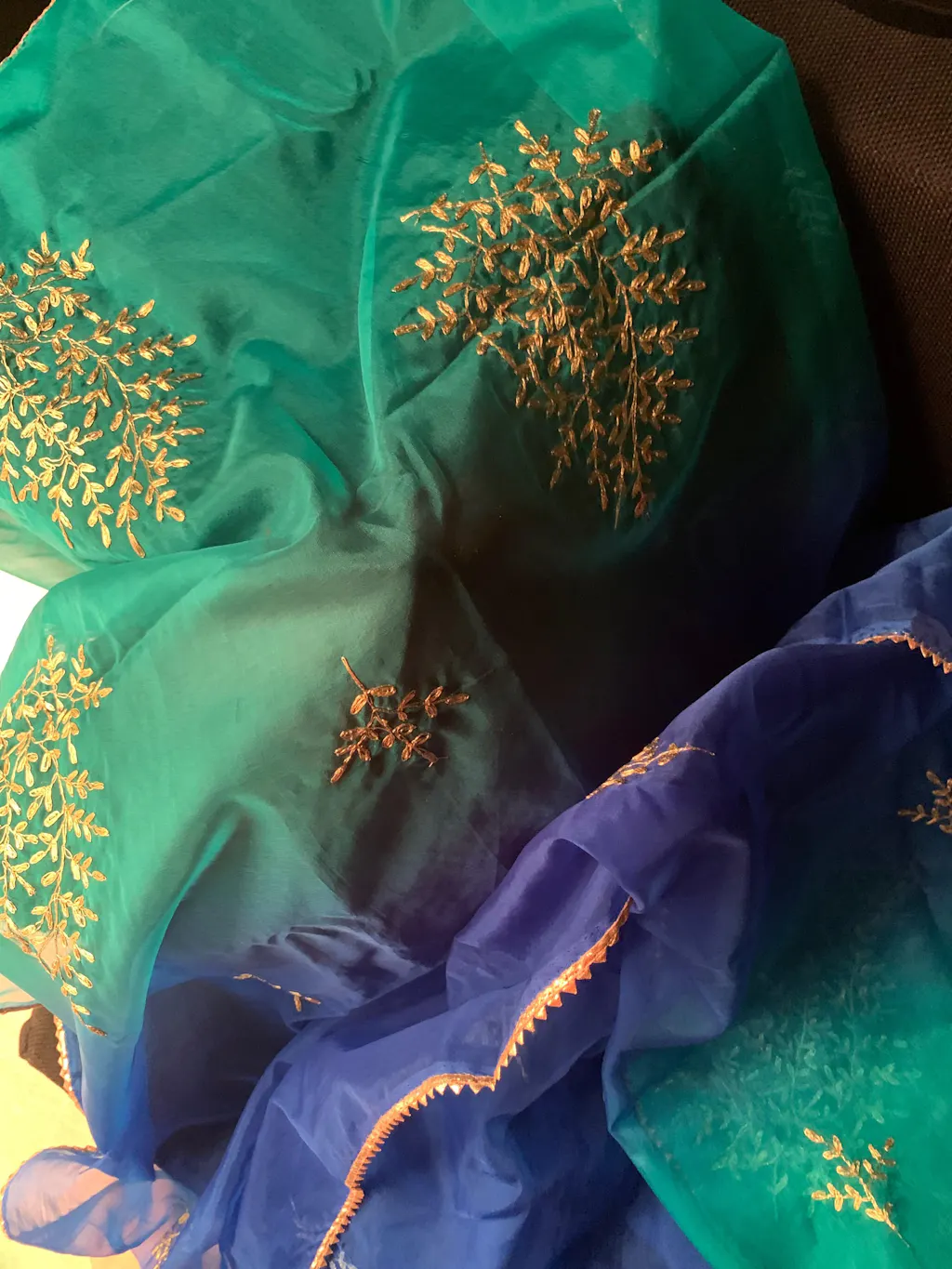 Green and Blue... colors bright and beautiful...with delicate gold motifs embroidered all over the Dupatta. finished with delicate gota..team this up with any attire...can go well for formal as well...