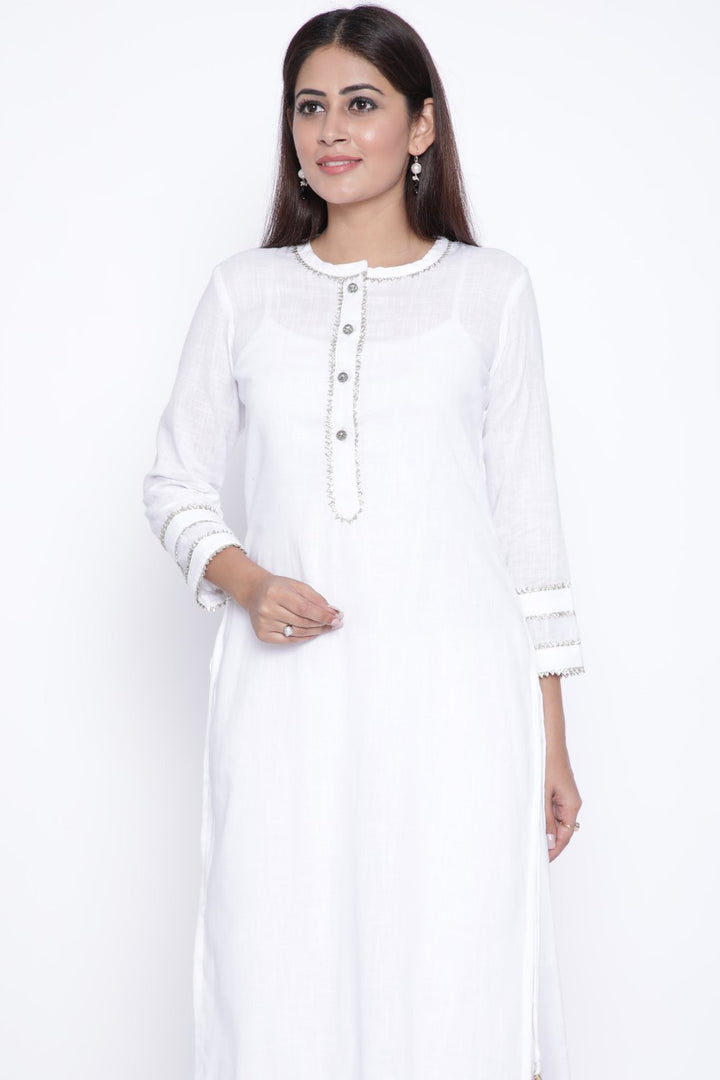 Spread love, peace and happiness with the White Kurti set with hints of Gota work on the neckline and sleeves...and team it with our colorful Tie-Dye Silk Dupatta in vibrant...